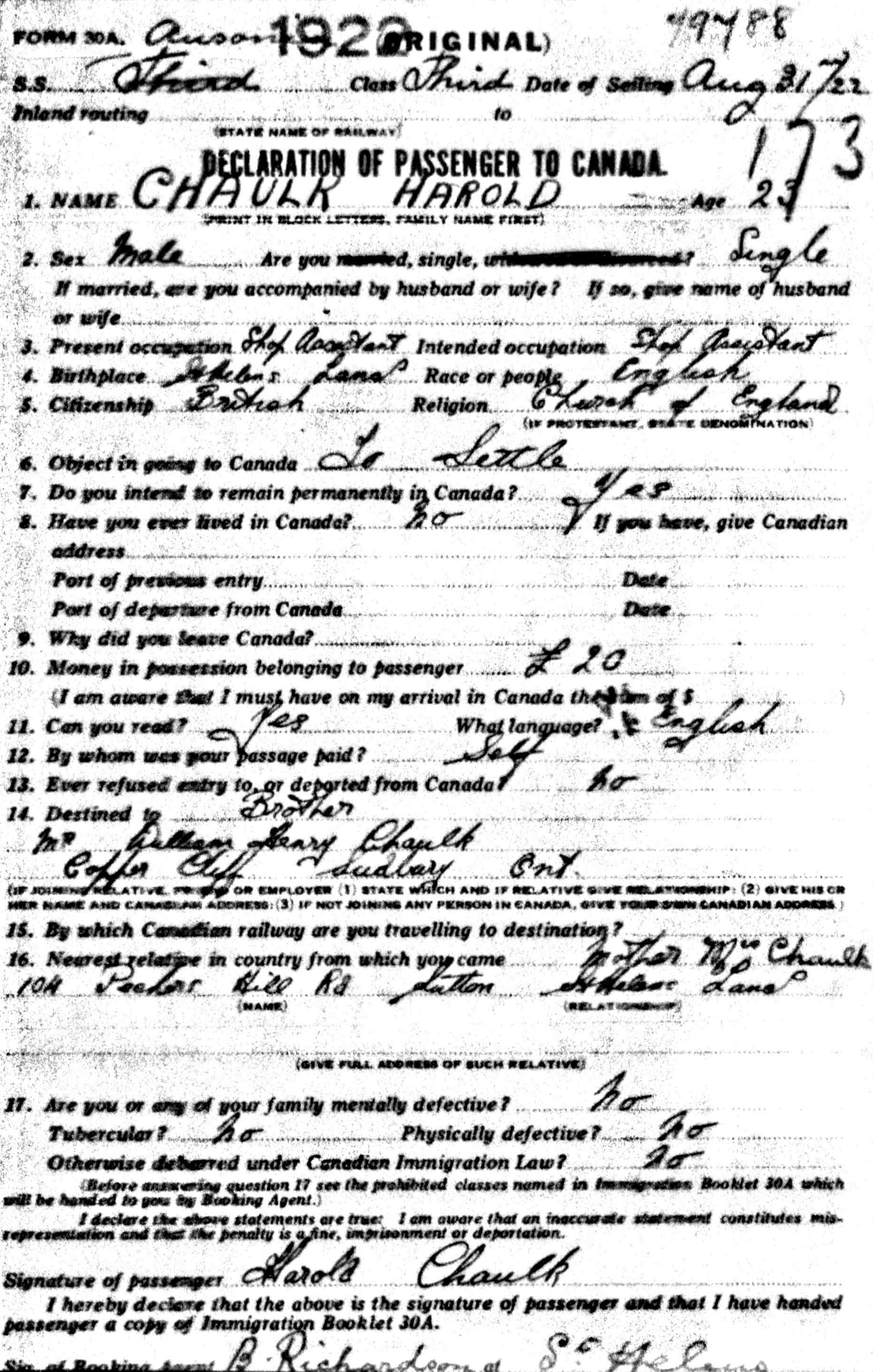 He lived with them for a while until he moved to Sudbury and became a postman. He worked for Canada post and retired about 1963." In the absent voters roll for 1918-1919 in St Helens, Lancashire, Charles Harold Anderson Chaulk (Pte 121039 RFC) is recorded at 104 Peckers Hill Road, Sutton. He also appears on the roll for 1920 and is still recorded as absent. Charles Harold Anderson Chaulk emigrated on 31 August 1922 from, ; On the passenger declaration Harold gave his present occupation and intended occupation as shop assistant and his intention was "to settle" permanently in Canada. He said he had not lived in Canada before and had £20 in his possession. He was destined for his brother's home in Coppercliff, Sudbury, Ontario, and gave his brother's name as William Henry Chaulk. He gave his mother Mrs Chaulk of 104 peckers Hill road, Sutton, St Helens as his nearest relative in the UK. He married Lena May Cashmore on 23 October 1926 at, Sudbury, Ontario, , Canada, and the ceremony was witnessed by Jane Ellen Cashmore and George Henry Hart; Charles was a pipe fitter and Lena May a housekeeper. Charles Harold Anderson Chaulk died on 9 January 1971 at Sudbury, Ontario, Canada, at age 72. He was buried at Parklawn Cemetary, Sudbury, Ontario, Canada. His obituary said that Harold ran away from home at the age of 17 to join the army. He served in the Signal Corps and the Flying Corps in WW1. He went to Canada in 1920 and worked for the Post Office. It was said that he knew every man, woman and child in Sudbury, and he was on a first name basis with them all.